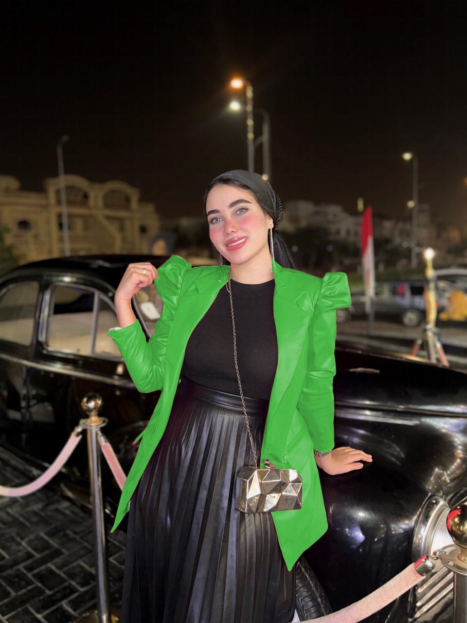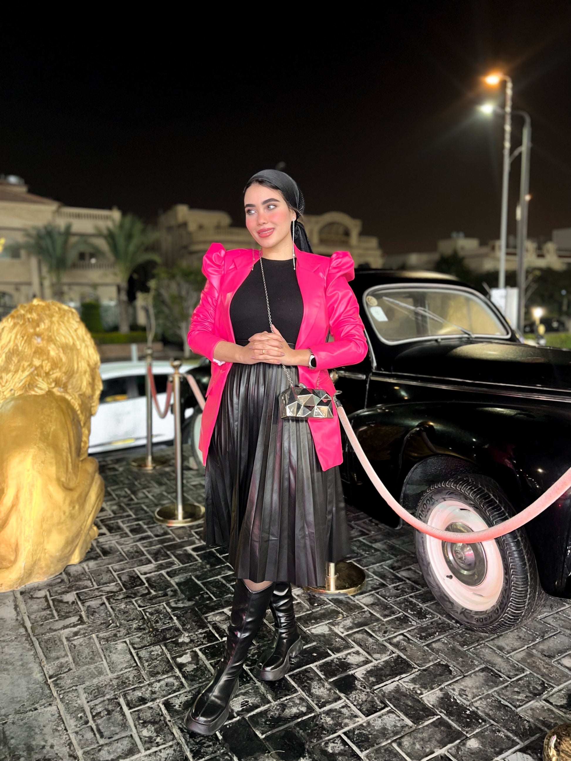 Unleash your inner confidence with this show-stopping blazer. Designed for those who aren't afraid to make a statement, this piece instantly transforms any outfit. It features a bold, structured silhouette defined by its dramatic padded, ruched shoulders and luxurious faux-leather finish. Available in an array of electrifying colors like Vibrant Fuchsia, Emerald Green, and Spicy Mustard, it's the perfect layering piece for an edgy, high-fashion look, day or night. Pair it with a simple black ensemble, as shown, to let the color truly pop.