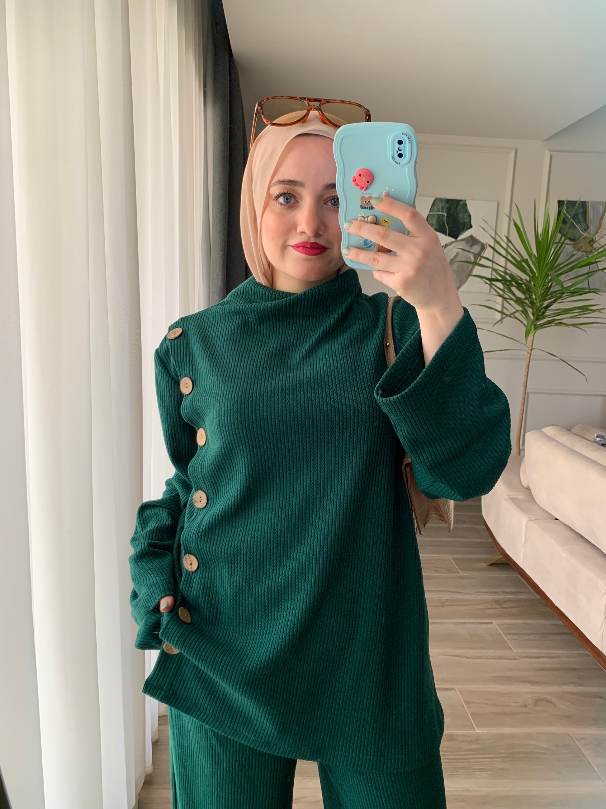 The top features a relaxed fit with side button details that add a soft feminine touch, while the matching ribbed pants offer a straight-cut silhouette for effortless movement.