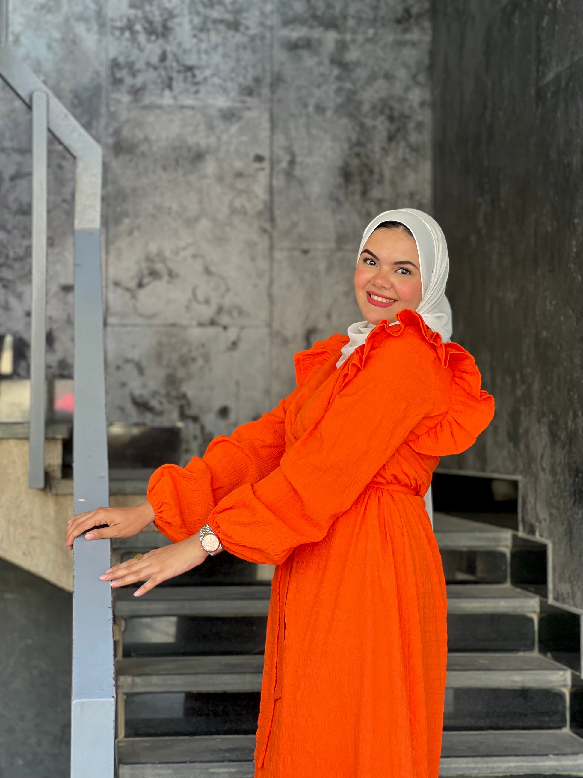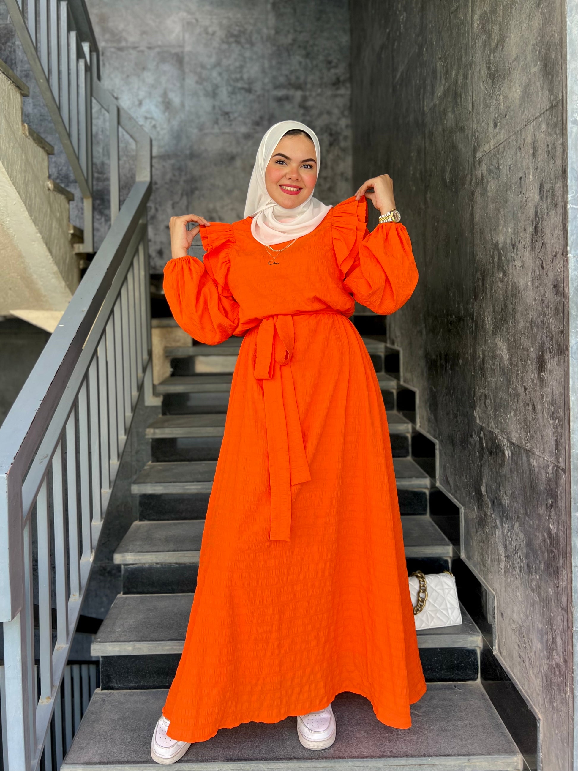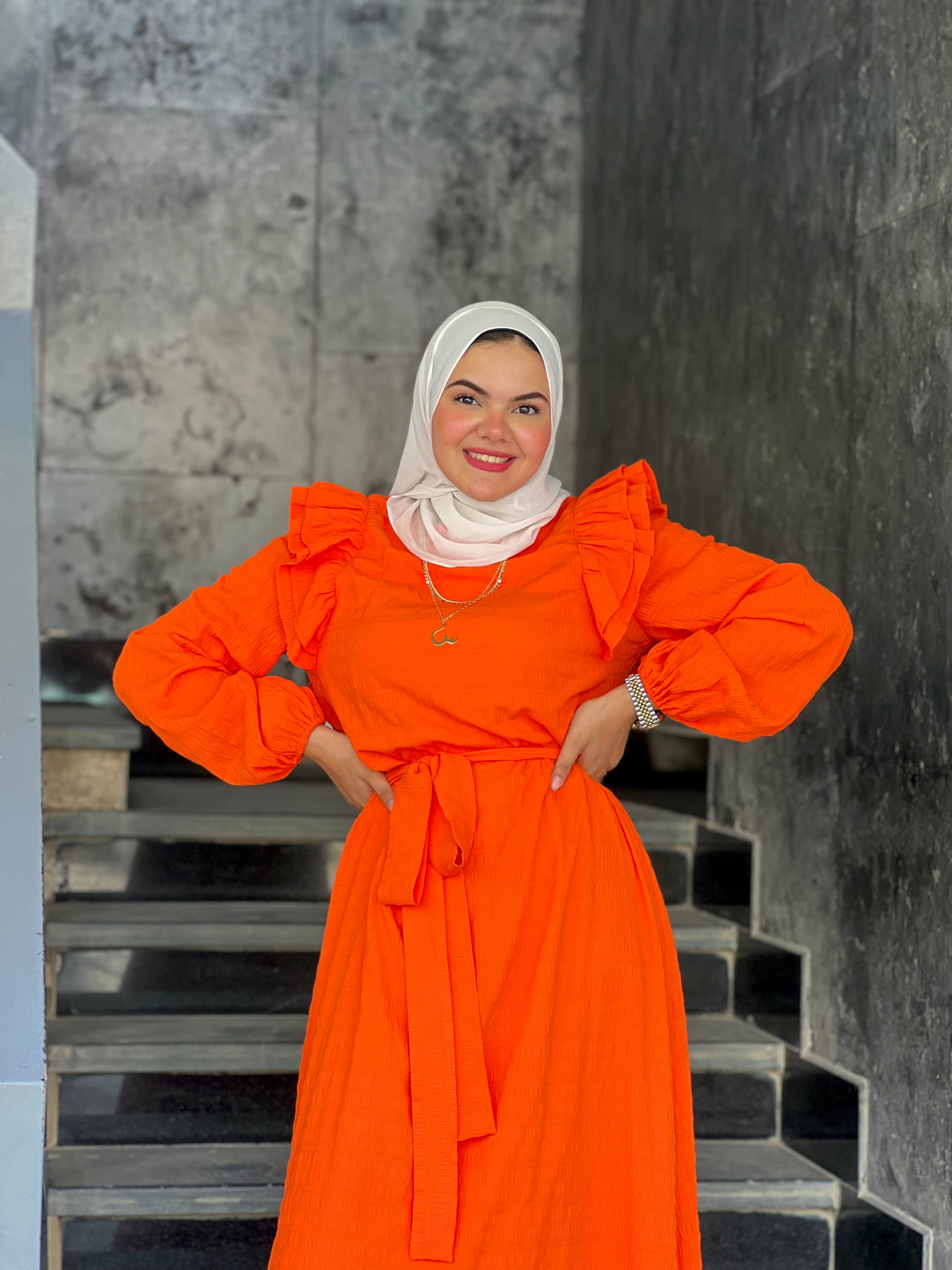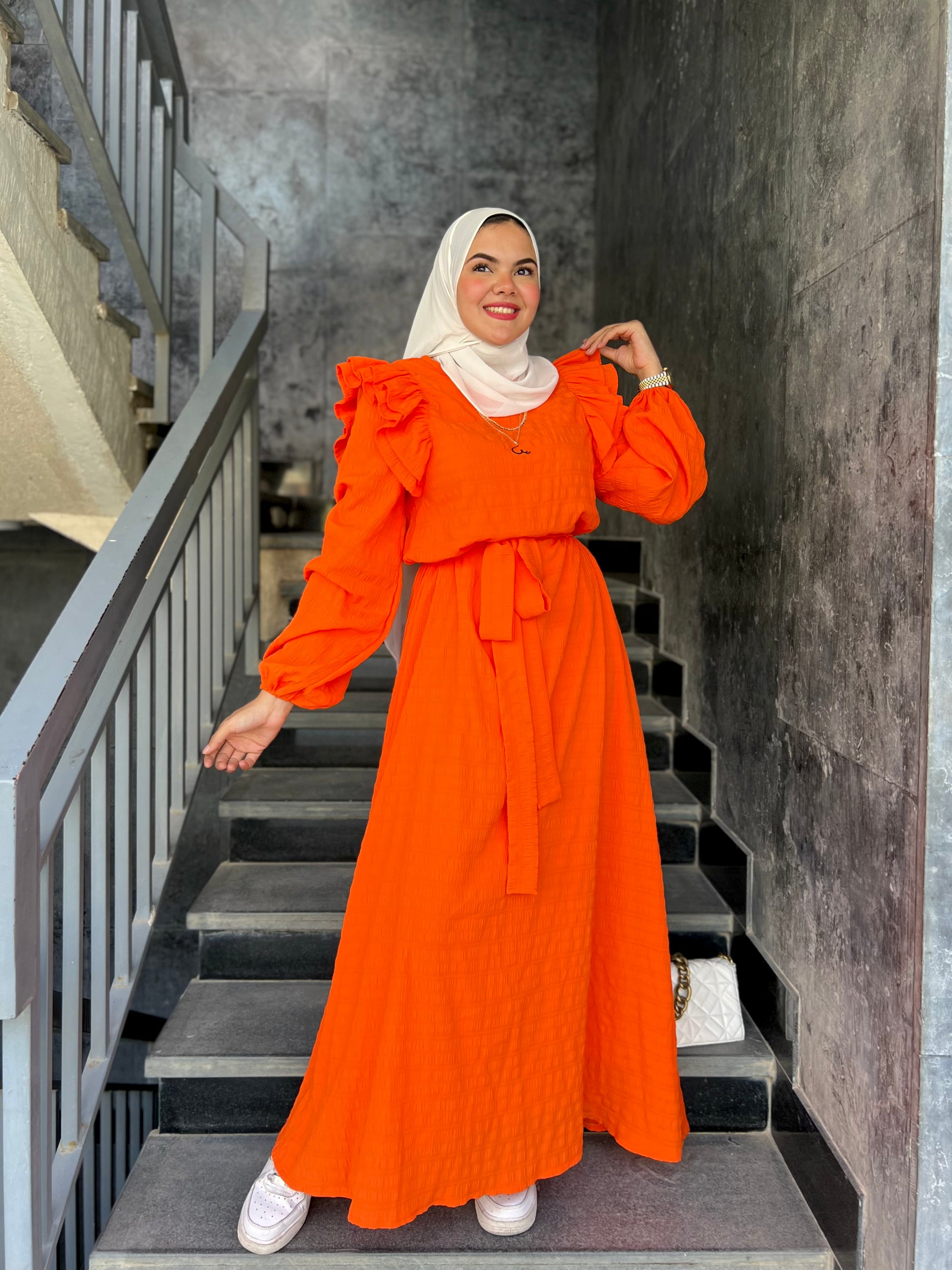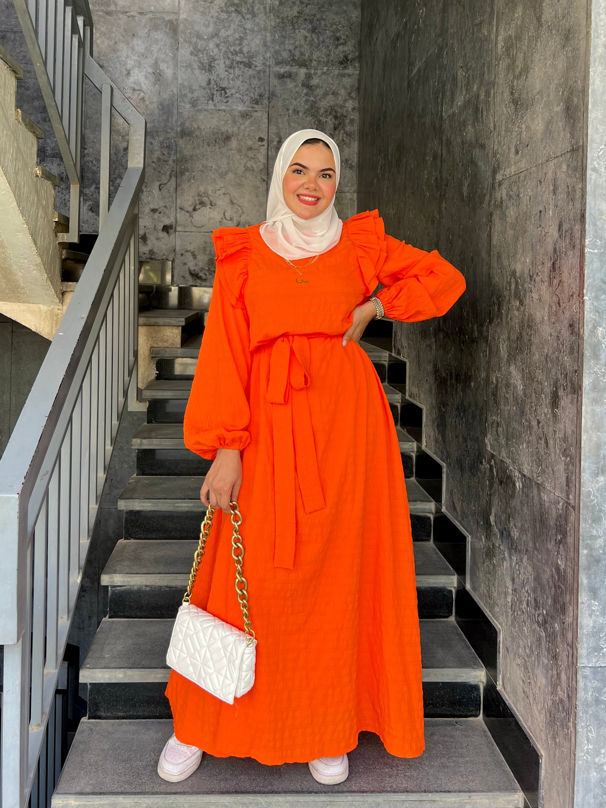 لو عايزة فستان يجمع بين الحيوية والأناقة، الفستان ده بلون البرتقالي الفاقع بيسيب انطباع جميل ويمنحك راحة وأناقة طول اليوم.