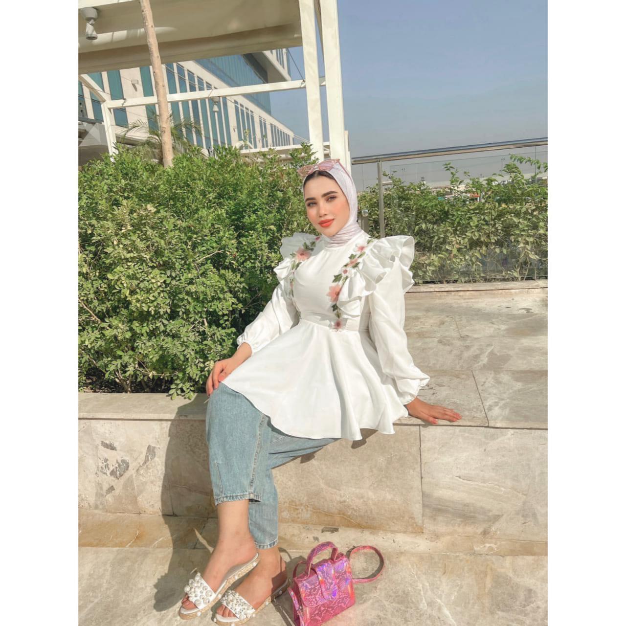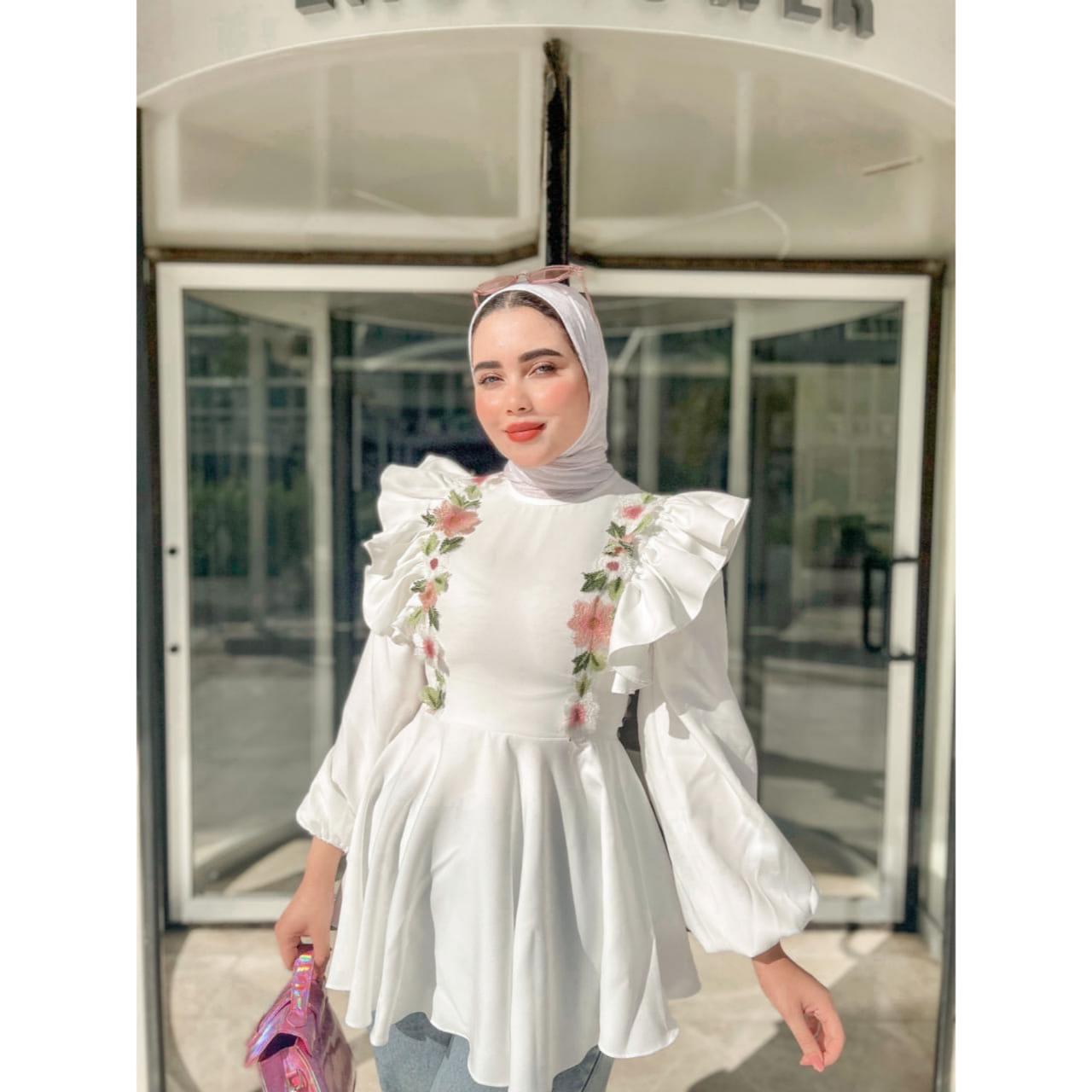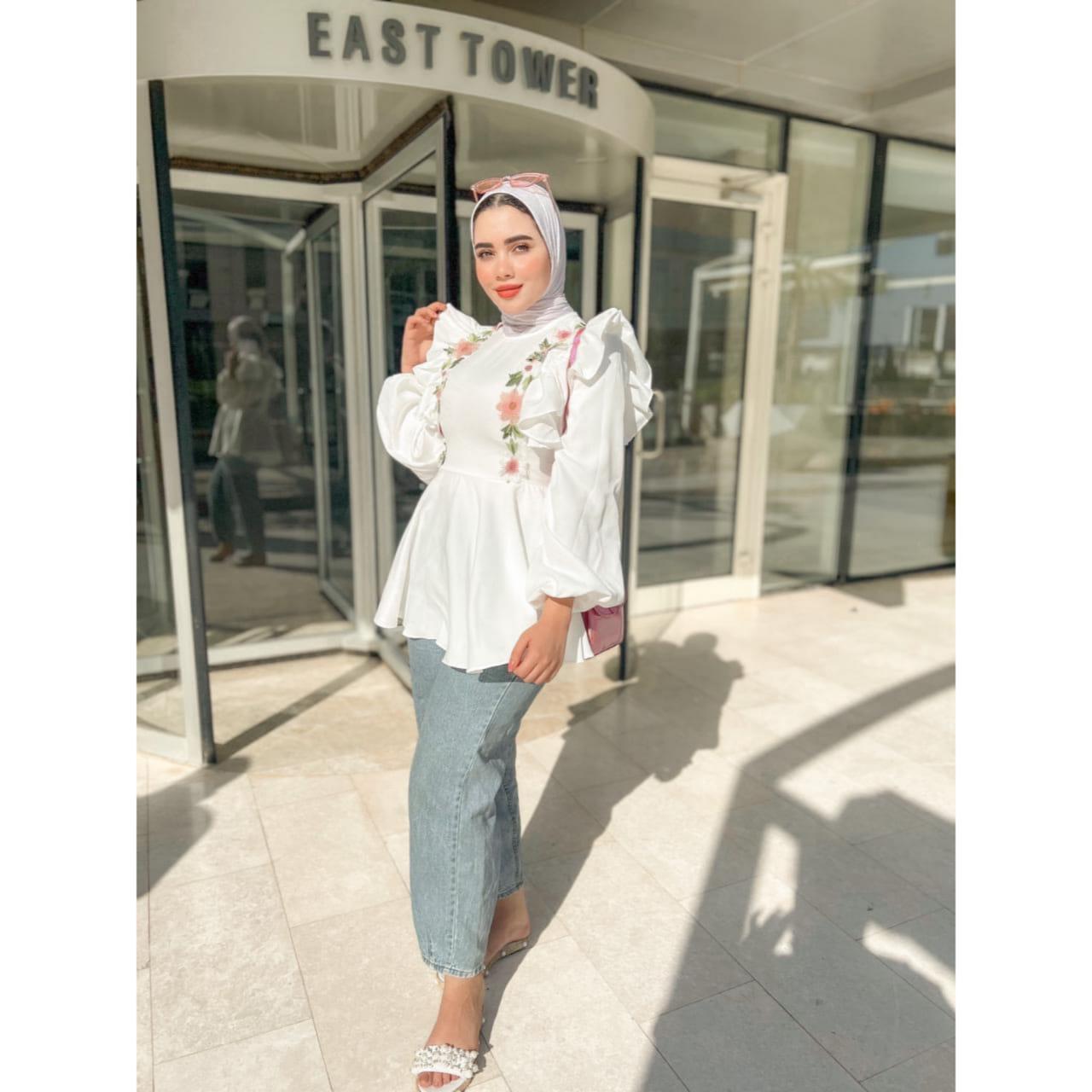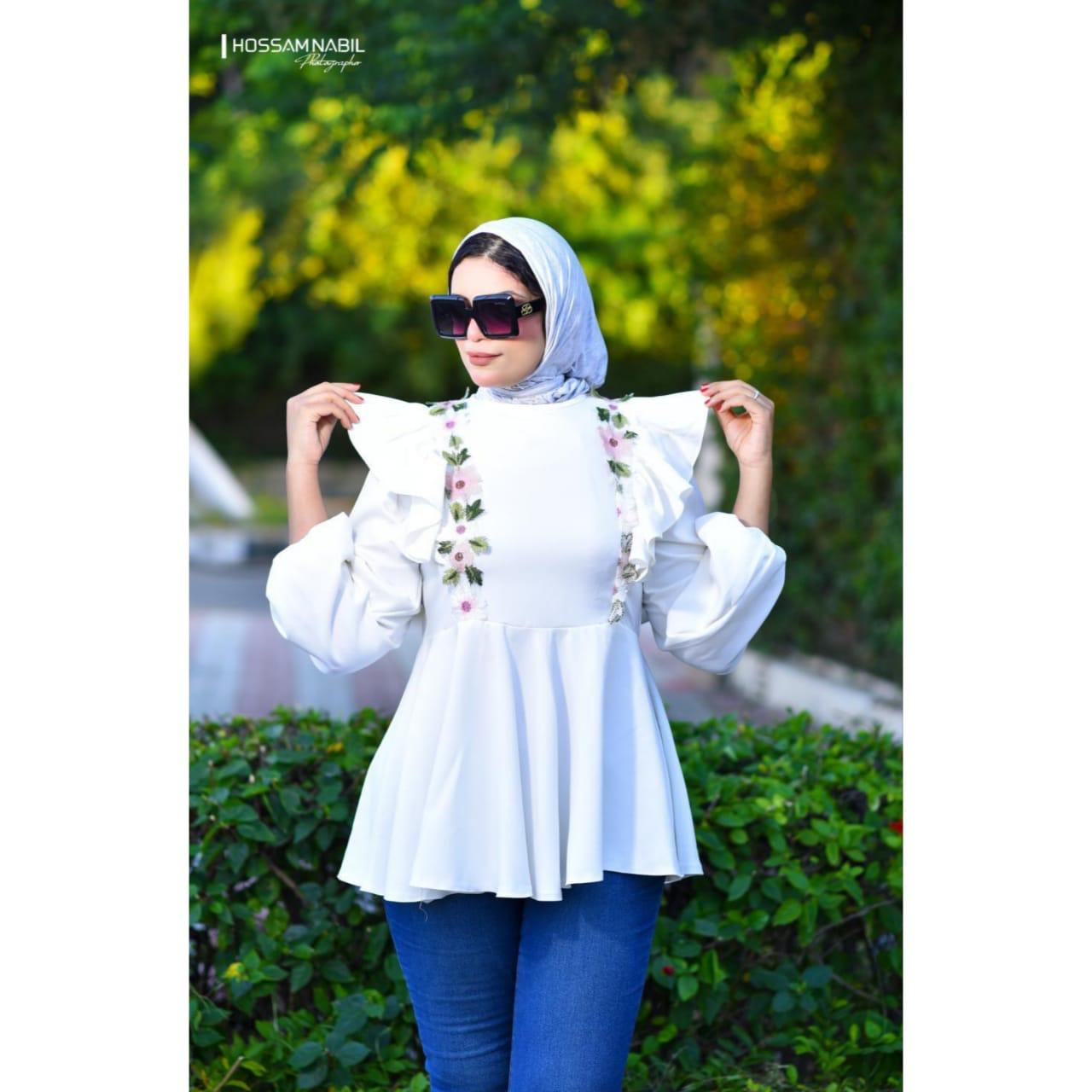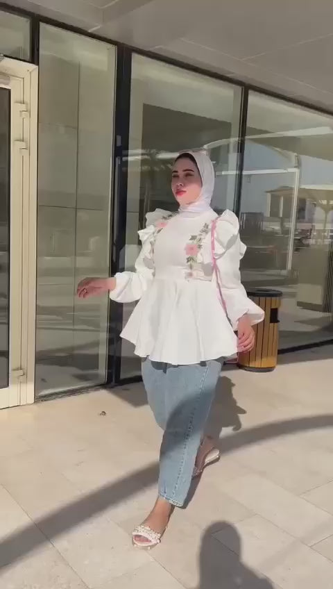 بلوزة أنيقة تتميز بتطريز زهور رقيق على الأكمام، مع تفاصيل كشكشة عند الأكمام. مصممة بخصر ملائم يتسع في شكل صورة ظلية أنيقة وفضفاضة. مثالية لإضافة لمسة من الأنوثة إلى خزانة ملابسك اليومية أو الرسمية.