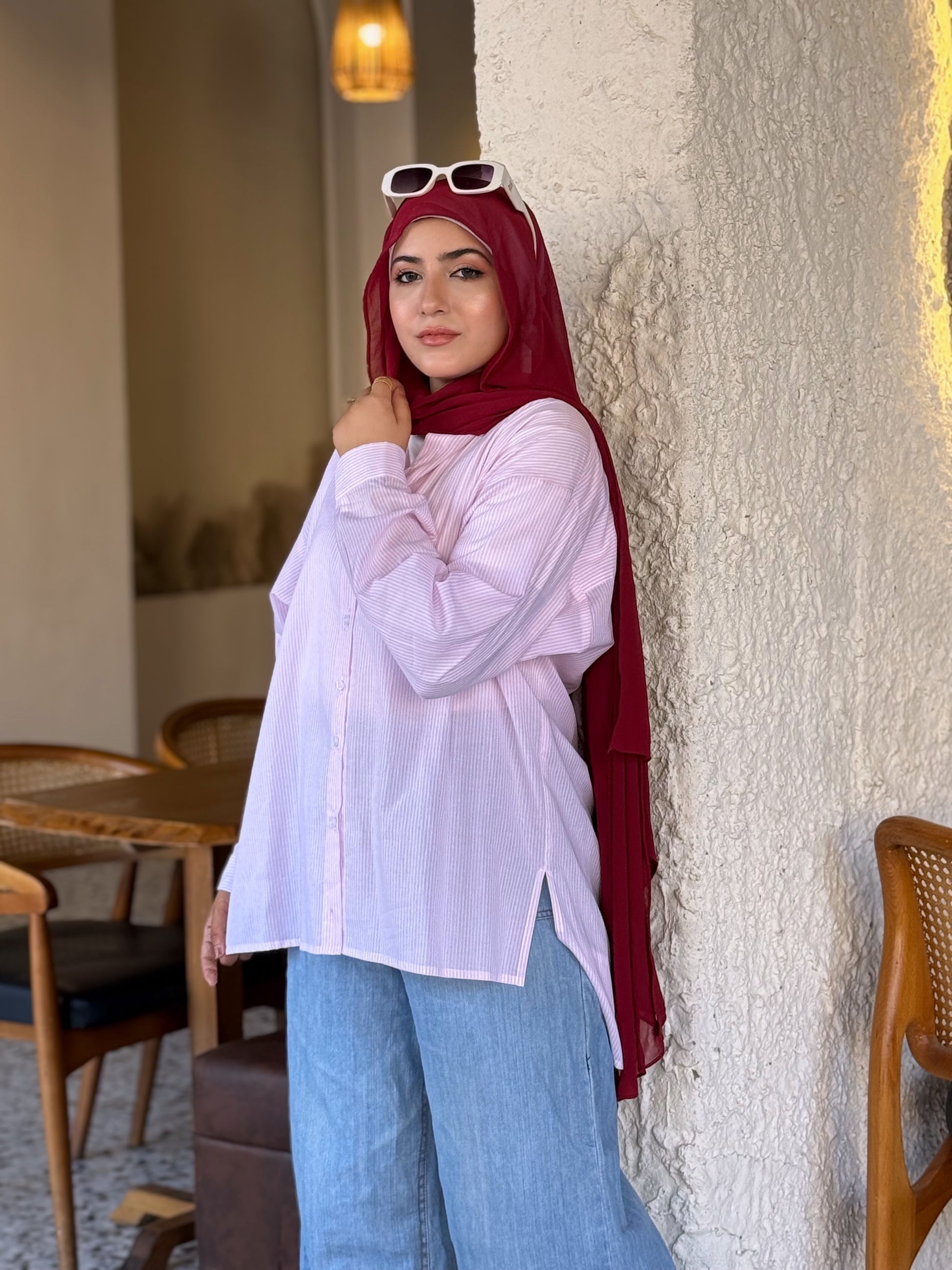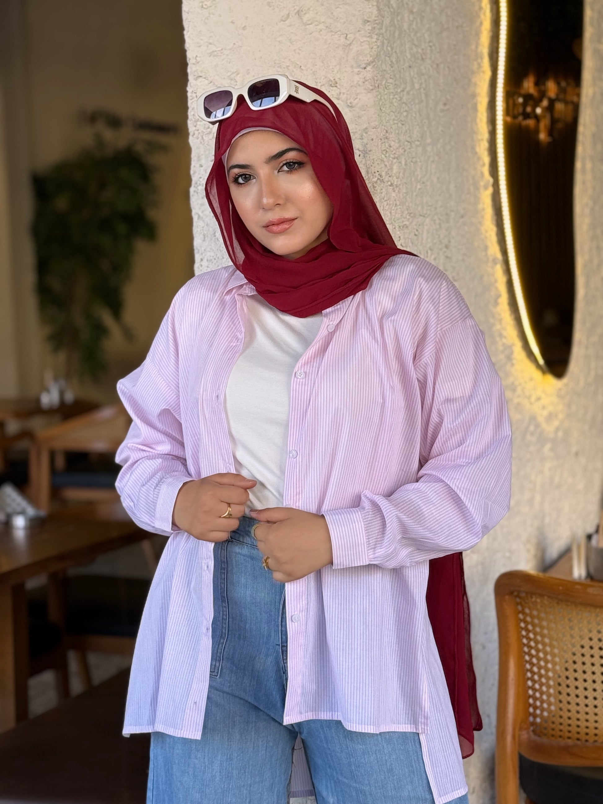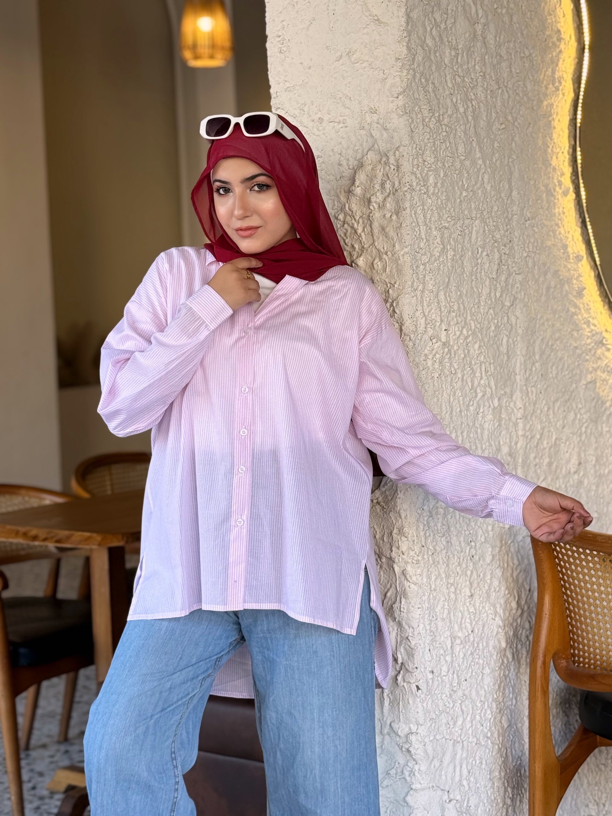 This stylish, oversized cotton shirt is your new go-to for casual days. Its rose pink color and subtle white stripes offer a modern look, while the longer back adds a touch of chic practicality. Pair it effortlessly with jeans or white trousers for a cool and comfortable outfit.