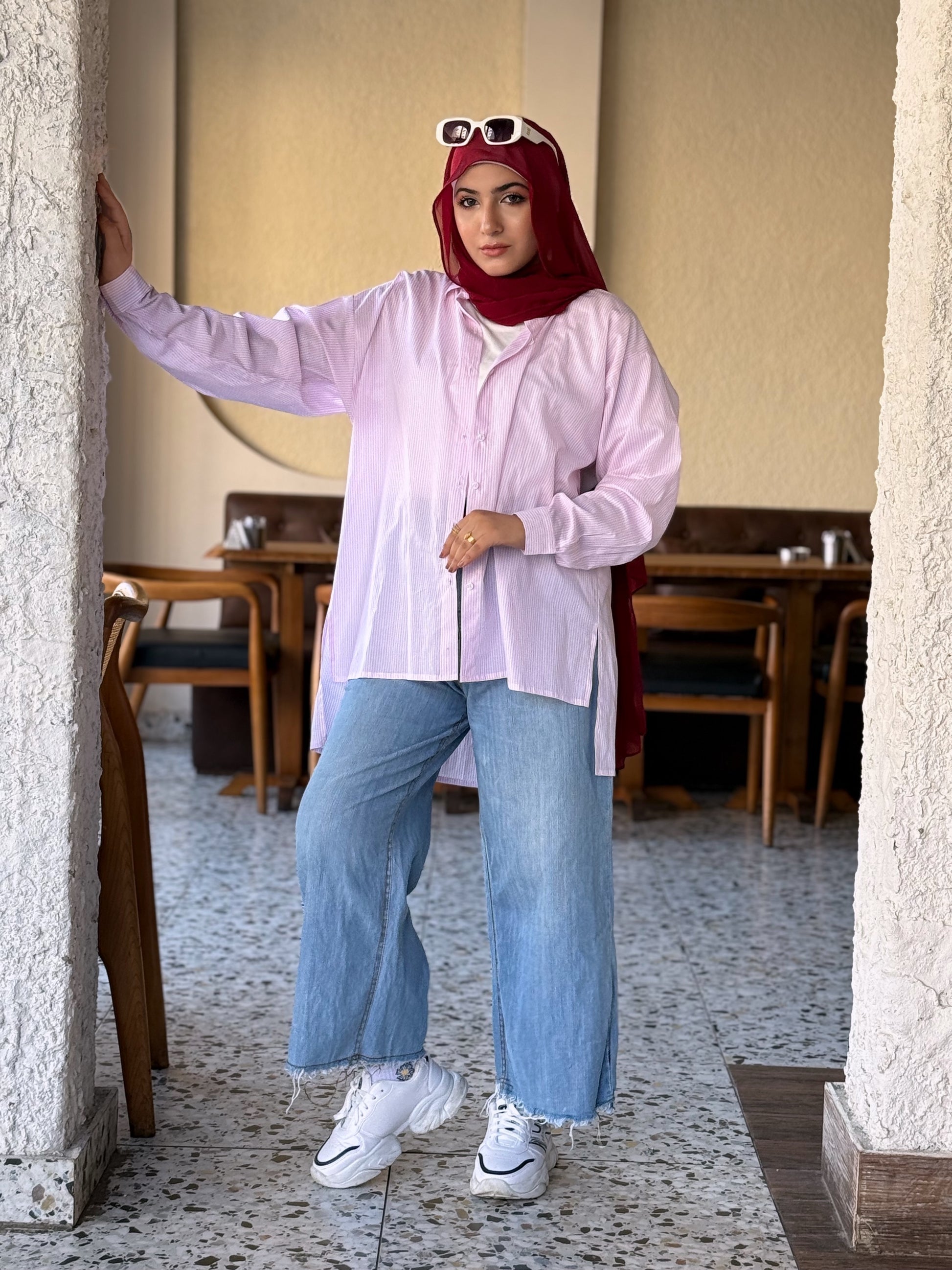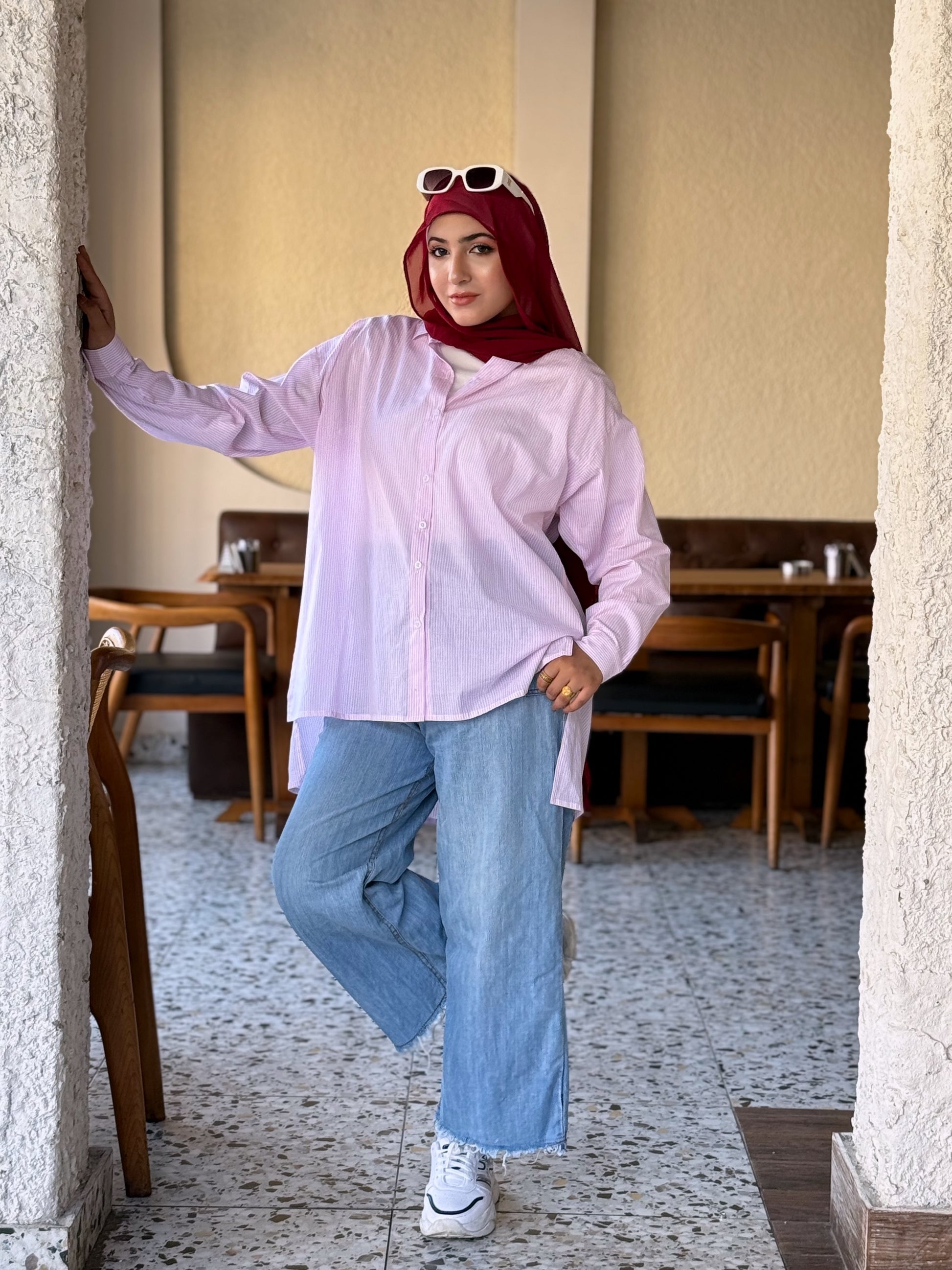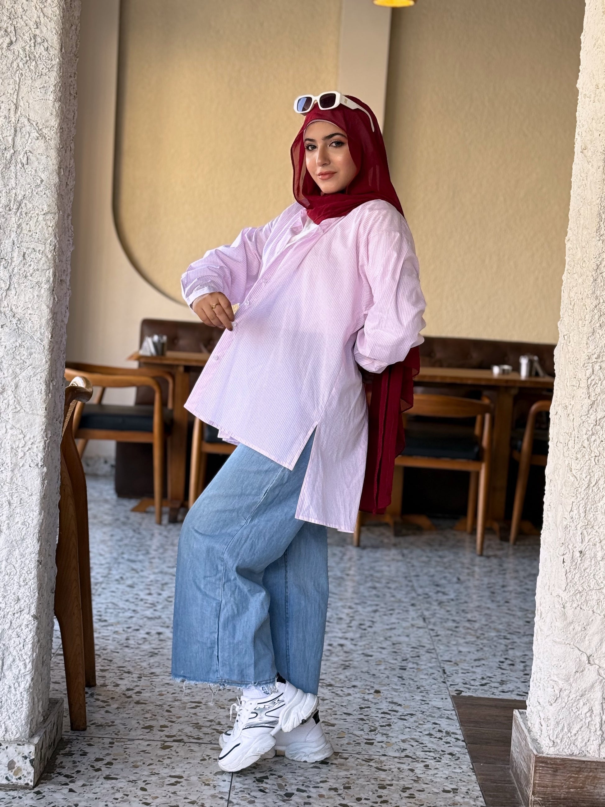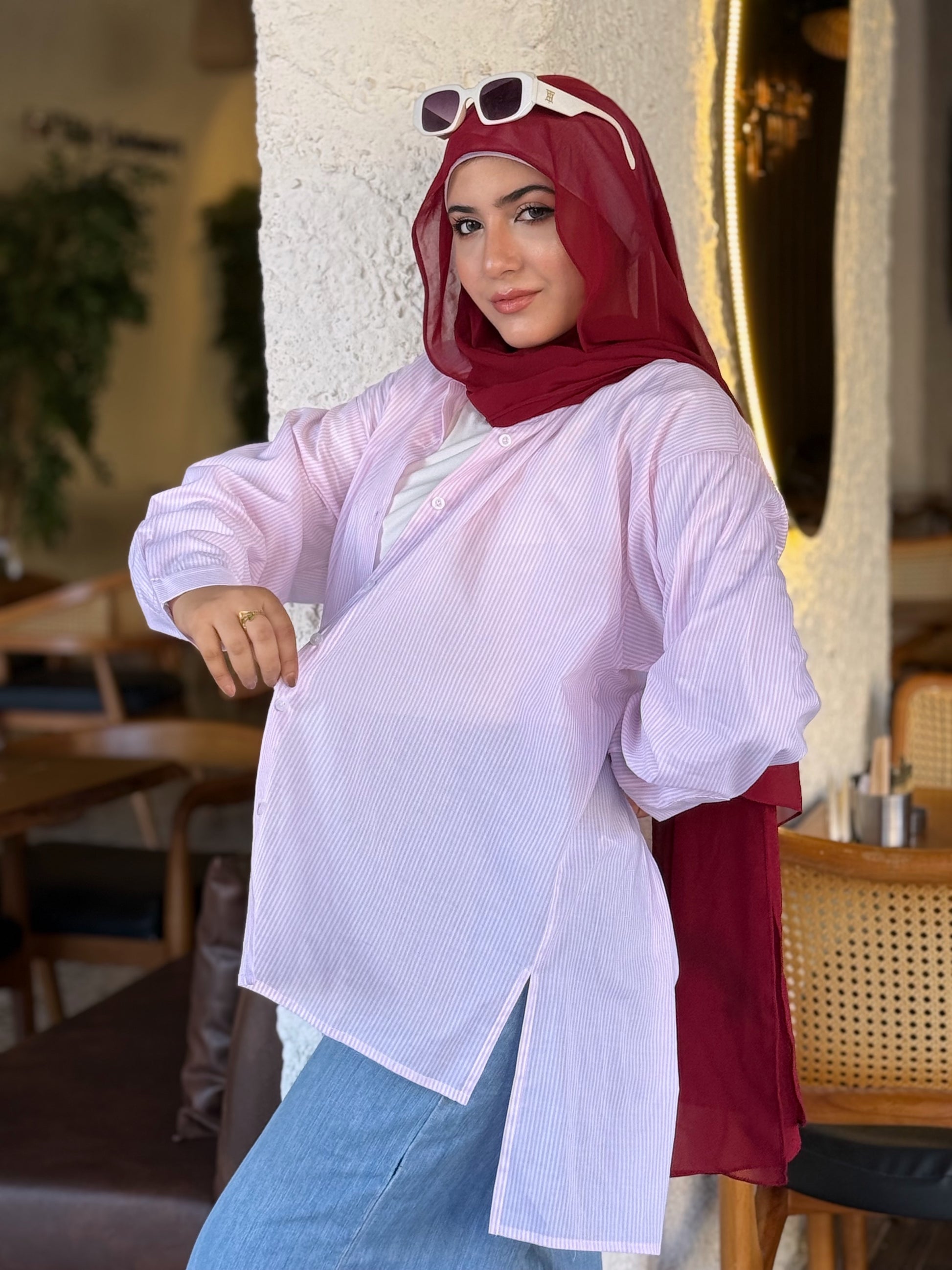 This stylish, oversized cotton shirt is your new go-to for casual days. Its rose pink color and subtle white stripes offer a modern look, while the longer back adds a touch of chic practicality. Pair it effortlessly with jeans or white trousers for a cool and comfortable outfit.