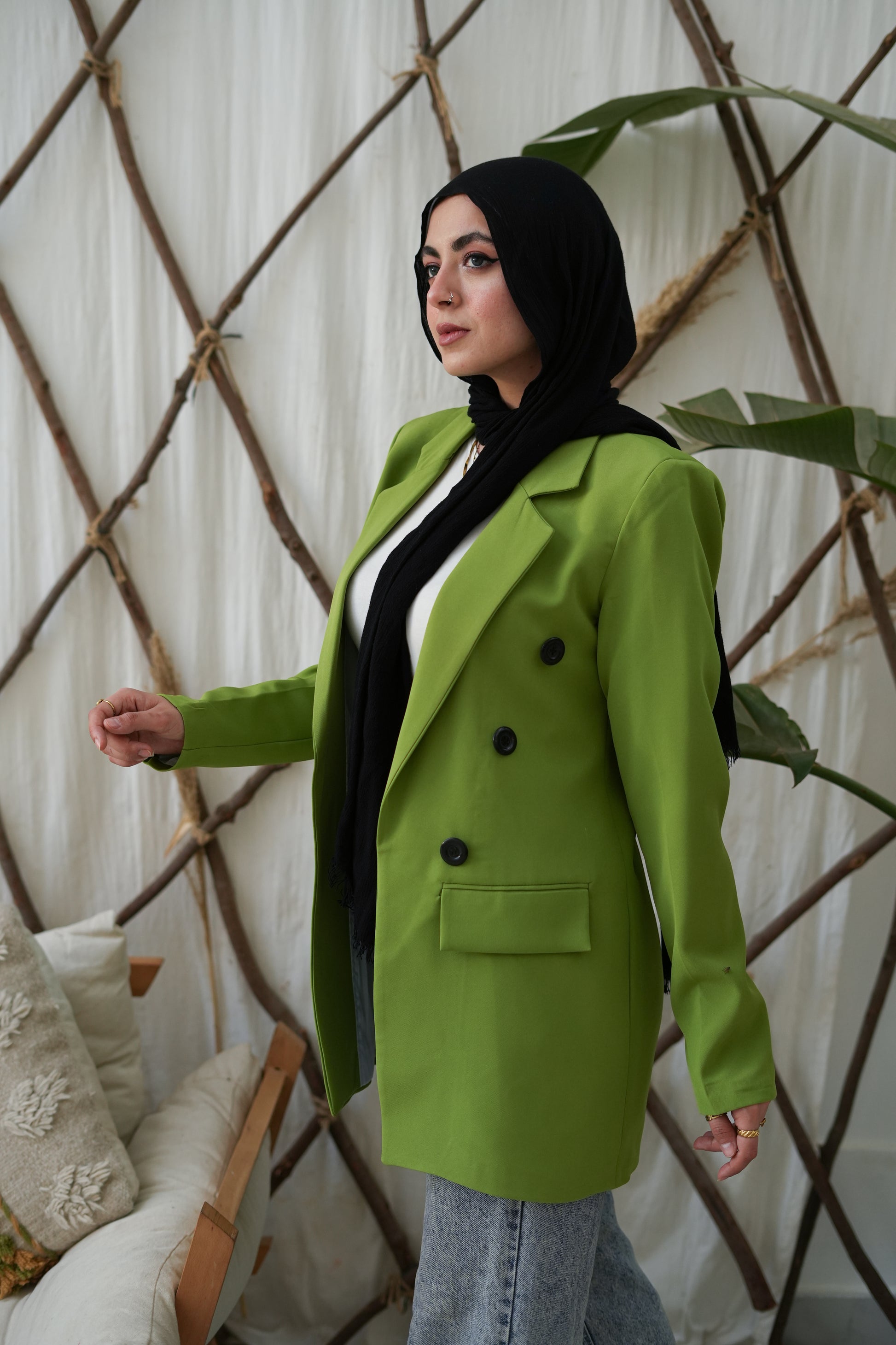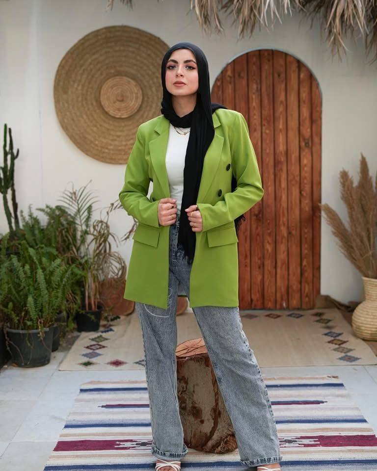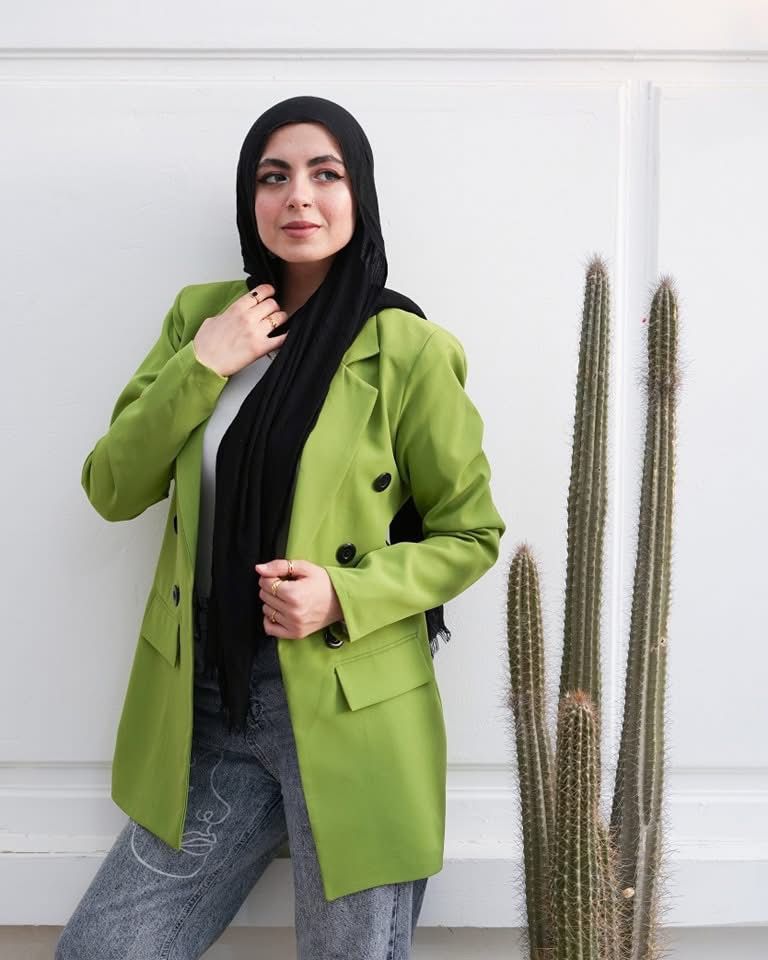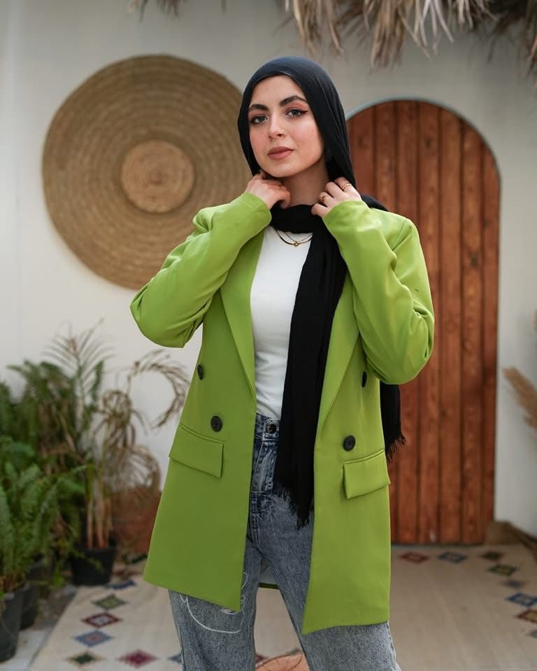 سترة كلاسيكية بقصّة مستقيمة وأزرار سوداء أنيقة لإضفاء لمسة من الرقي. بطول 80 سم، فهي مثالية للإطلالات الرسمية وغير الرسمية على حدٍ سواء، وهي قطعة أساسية في خزانة الملابس لكل موسم.