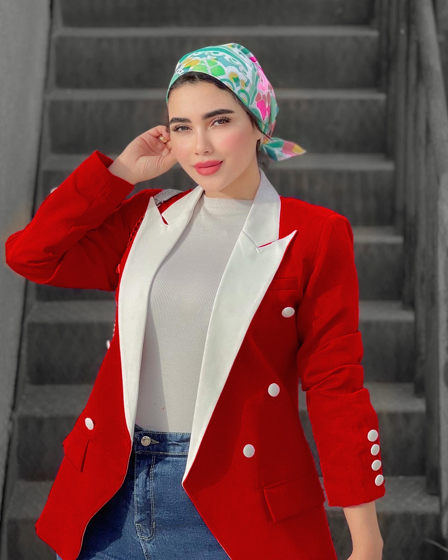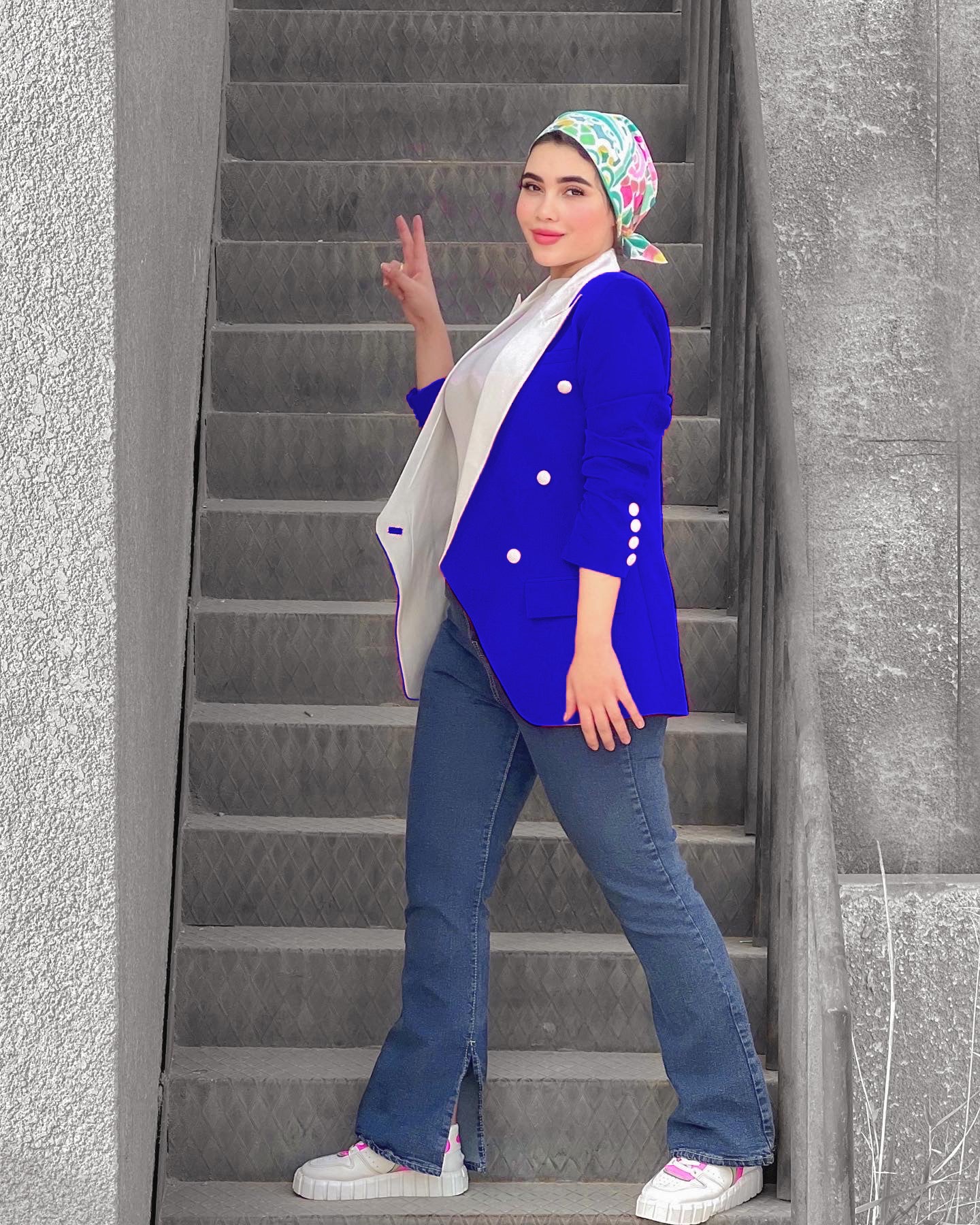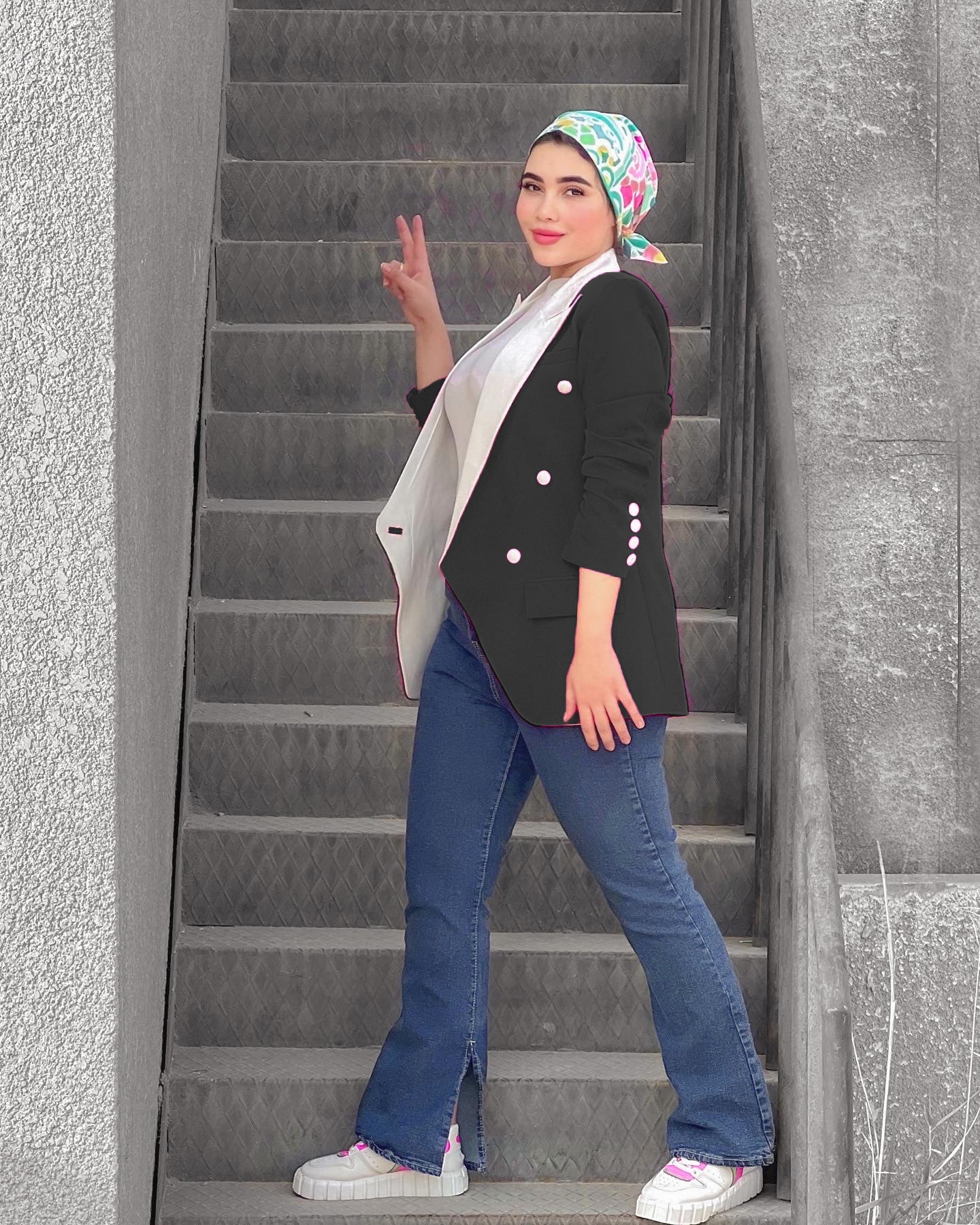 سترة أنيقة بفتحة على شكل حرف V تتميز بطية صدر كلاسيكية بيضاء وأزرار بيضاء متناسقة لإطلالة أنيقة وعصرية بطول 75 سم. مثالية لكل من المناسبات المهنية والنزهات غير الرسمية.